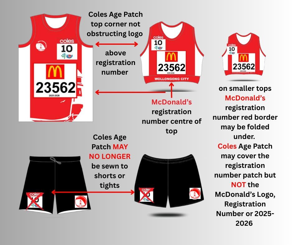 Registration numbers must be clearly displayed on the front of the uniform T-shirt, singlet top, one piece or two piece uniform, so it is visible at all times when competing.
